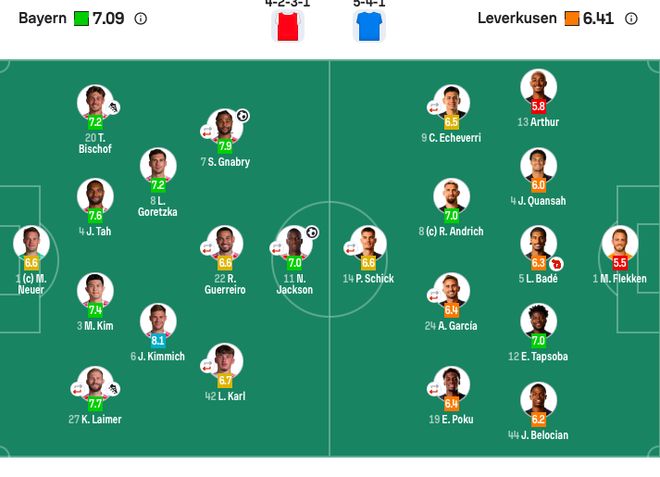 拜仁首发:1-诺伊尔、4-塔、3-金玟哉、22-格雷罗(79’45-帕夫洛维奇)、20-比朔夫、27-莱默尔(75’23-博伊)、8-格雷茨卡、6-基米希、7-格纳布里(60’17-奥利塞)、42-伦纳特·卡尔(60’14-迪亚斯)、11-杰克逊(60’9-凯恩)。